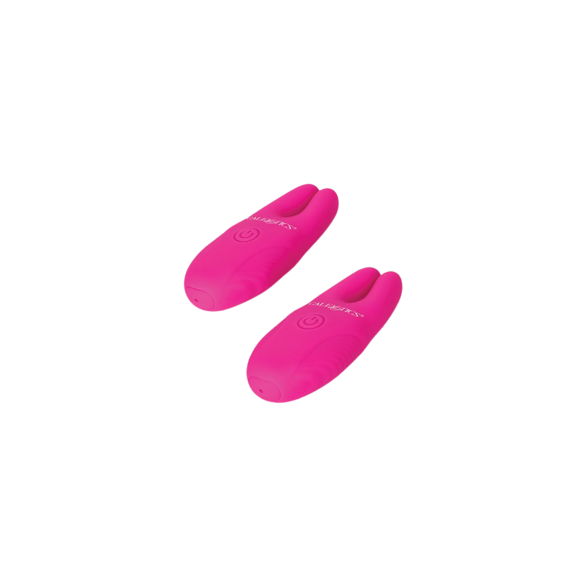 Blur the borders between pleasure and pain even further with the game-changing Silicone Remote Nipple Clamps. This daring designer nipple clamp set features 12 independently controlled functions of vibration, remote control and USB rechargeable battery. Clamp these multi-use teasers to your body and enjoy every rush of stimulation as you flicker through the powerful functions of vibration as the touch of the remote. As the tension tightens, the tingles intensify with every touch of the button for the ultimate in nipple stimulation toys. The discreet mini remote control makes it easy to enjoy adventurous foreplay. Once fully charged, the versatile teasers have an orgasmic controller range of up to 32.75 ft (10 m) away! A single touch button controls up to 40 minutes of vibrating pleasure. Recharge your pleasure in only 1 hour with the dual charging USB cable into the self-sealing charging port. Take you pleasure to go with the travel lock feature, simply hold the power button for 3 seconds to turn on/off.