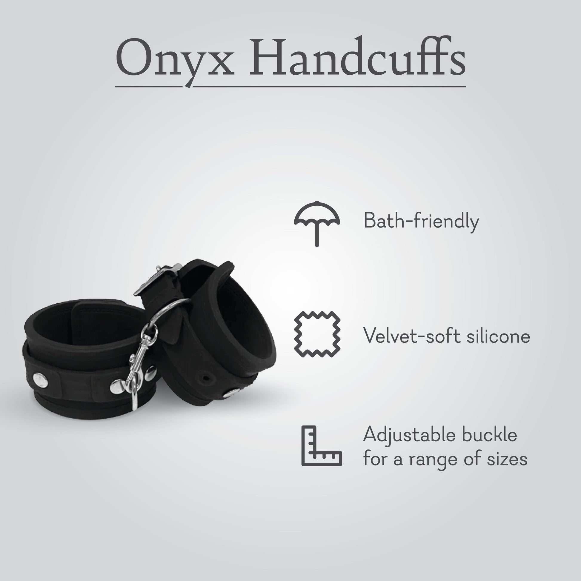 Get all of the pleasure and none of the pain with these soft silicone Onyx Handcuffs. Designed with a supple and smooth silicone, these handcuffs give the look and binding power of traditional leather cuffs and eliminate any unwanted discomfort from tough leather. The buckle closure makes it easy to fit wrists of all sizes. Metal loops let you play however you like, and a removable lobster clasp provides varying levels of restraint. Take control—or give in to control—with the Onyx Handcuffs tonight.