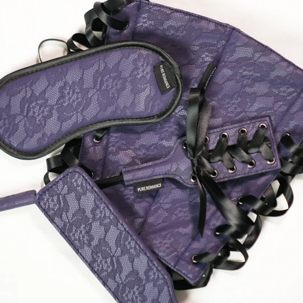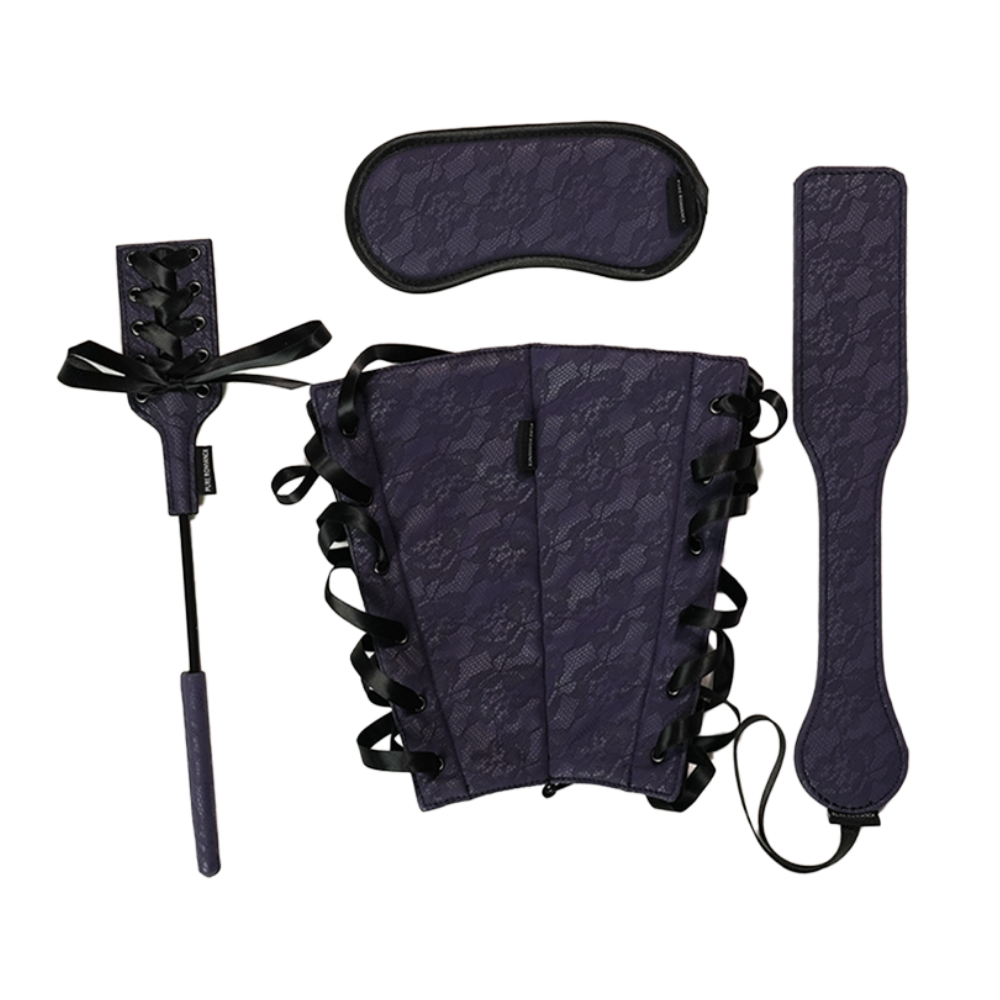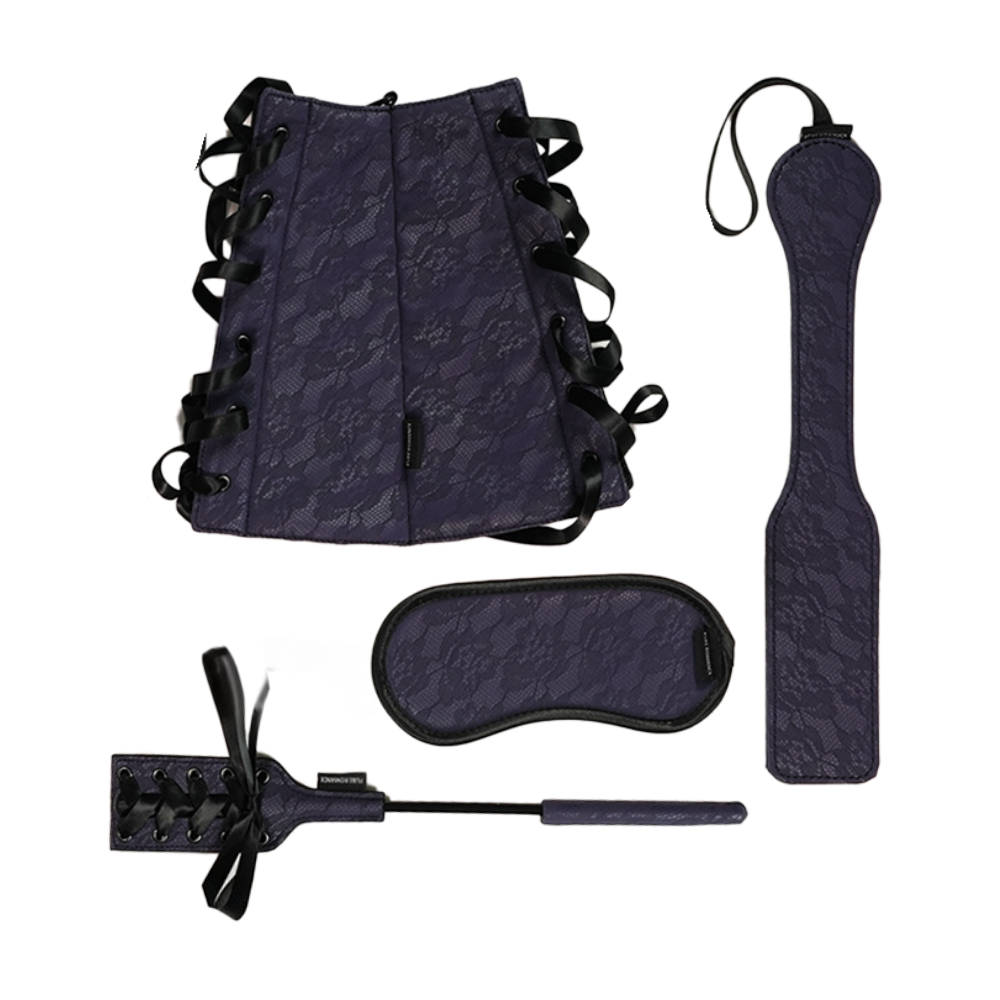Delve into a whole new world with a luxe, four-part set featuring a blindfold, paddle, crop, and arm restraints. The paddle and crop take painful pleasure experiments to mastery, the blindfold removes sight to spotlight sensation, and the arm restraints bind for sultry submission. Satin accents and plush, lace-print material add a touch of softness to contrast the bold intensity of play. Try each accessory one by one and make it a slow descent into all things erotic, or pair off parts of the set for multi-faceted satisfaction that exceeds expectations time and time again…
