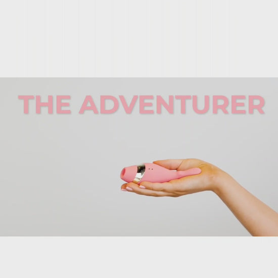 Meet your match with The Adventurer, an exclusive invitation to pleasure. This expertly crafted accessory allows you to explore new dimensions of desire with different types of clitoral stimulation. Set in premium silicone, the gold accent adds a luxe touch while the rounded shape fits perfectly in hand. Let the textured end tantalize with multiple vibration speeds and patterns or fit the accessory's opening around the clitoris for air pressure that takes your breath away.